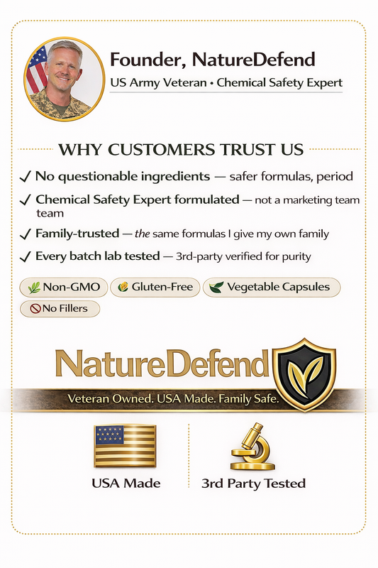 A U.S. Army Veteran with a background in chemical safety looked at what his family was taking and didn't like what he found. Overseas manufacturing. Questionable ingredients. No accountability. He spent years fixing that. NatureDefend is the result.