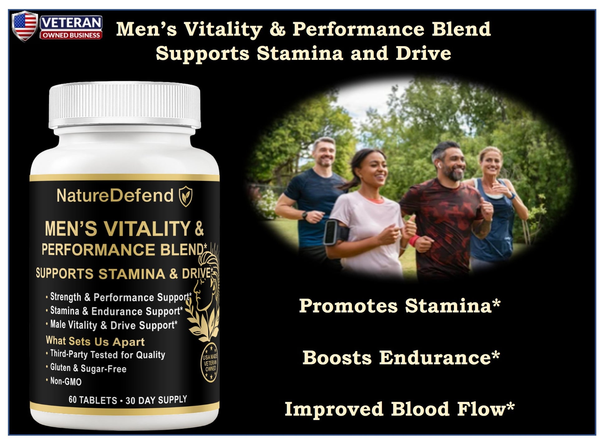 Non-GMO, gluten-free, sugar-free, and third-party tested for quality. Proudly made in the USA by a veteran-owned company committed to men’s health and performance.
